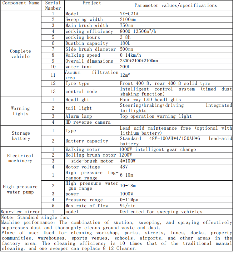 Brukssted: Brukes til rengjøringsverksted, parker, gater, baner, brygger, eiendommer, lager, sportssteder, skoler, flyplasser og andre områder i det fabrikke området. Rengjøringseffektiviteten er 10 ganger for den tradisjonelle manuell-rengjøringen, og en feier kan erstatte 8-12 rengjøringsmidler