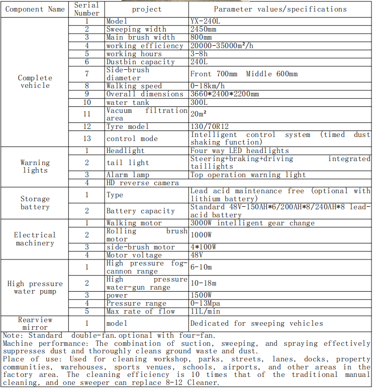 Brukssted: Brukes til rengjøringsverksted, parker, gater, baner, brygger, eiendommer, lager, sportssteder, skoler, flyplasser og andre områder i fabrikkområdet. Rengjøringseffektiviteten er 10 ganger for den tradisjonelle manuell-rengjøringen, og en feier kan erstatte 8-12 rengjøringsmiddel.