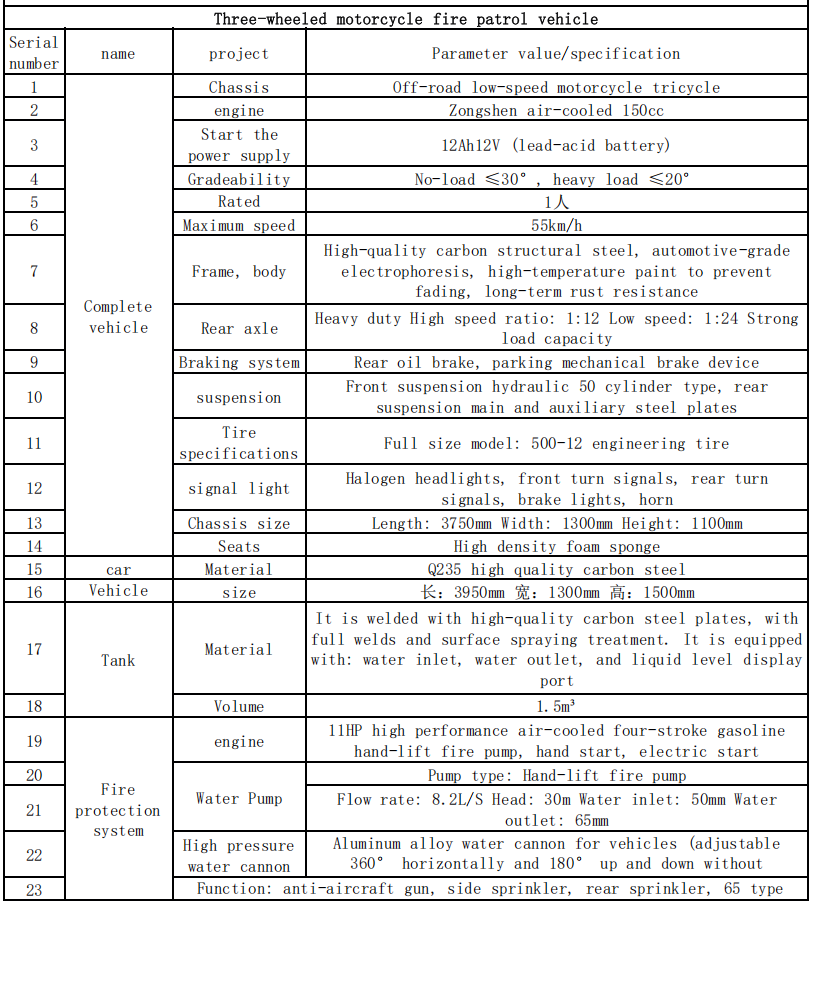 Med tanke på den lave klassen på landsbygda og lang avstand fra brannstasjoner, kan trehjulede brannmotorsykler brukes som hovedutstyr for profesjonelle brannbrigader. De kan bære mer forsyninger enn tohjulede kjøretøyer og er mer tilpasningsdyktige til komplekse veiforhold enn firehjulede brannbiler, og innser "nærliggende politiets utsendelse og rask avhending."