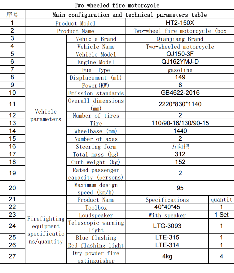 Den terrenget brannslukking av motorsykkelen har utmerket terrengytelse. Det kan raskt og fleksibelt utføre brannslukking og redning på robuste fjellveier eller smale gater. I tilfelle av plutselig brannfare, kan det bære 3 personer til å danne et kampteam for å slukke brannkilden.